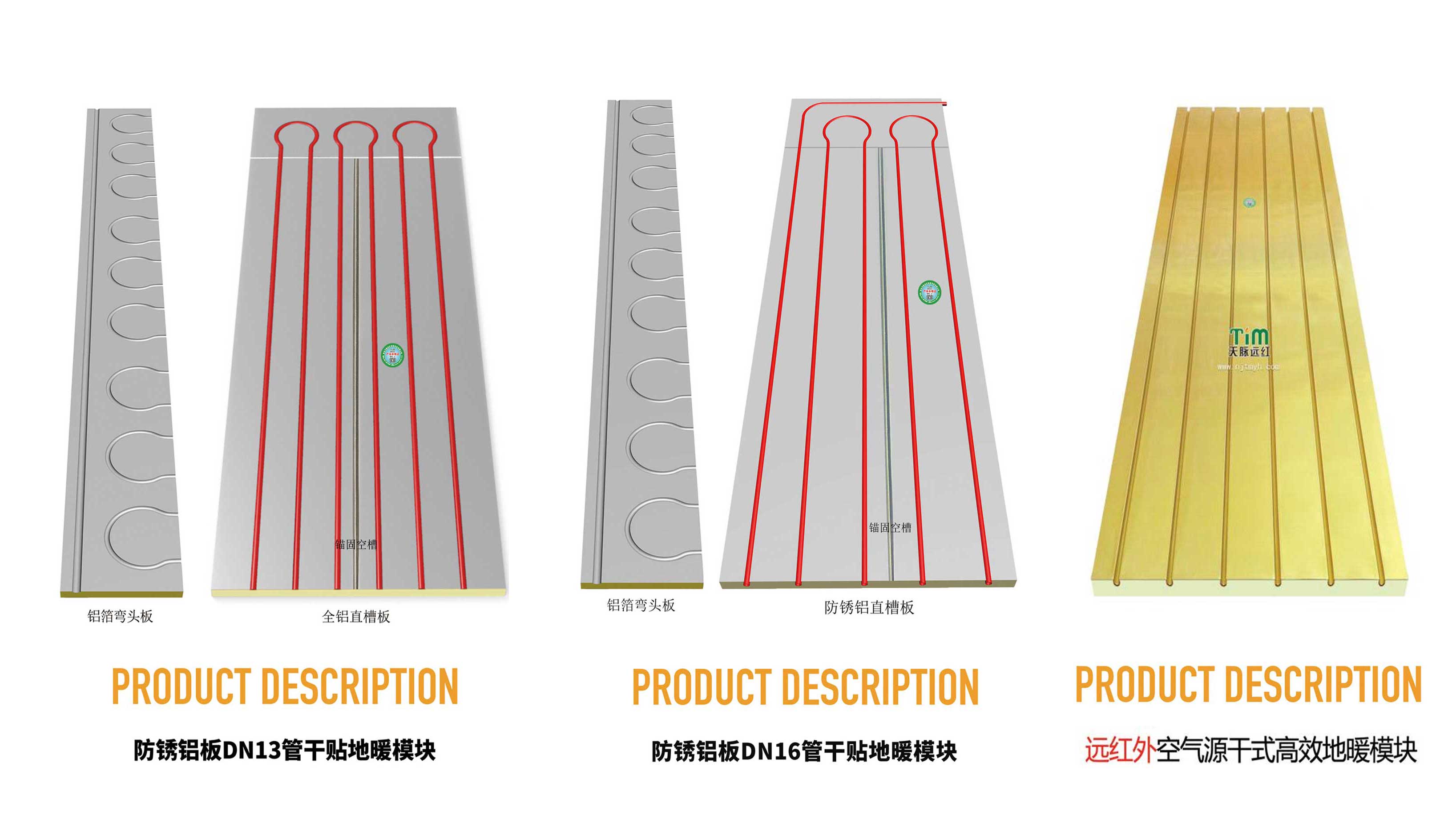 公司產(chǎn)品包括全鋁板環(huán)保干式水/電地暖模塊系列、遠紅外干式地暖模塊系列、空氣源熱泵高效末端系列、老房快裝地暖系列、汗蒸房墻暖系列。產(chǎn)品入選《百年中國》科技匯編,被中國建筑裝飾裝修材料協(xié)會認定為中國綠色、節(jié)能、環(huán)保建材產(chǎn)品。